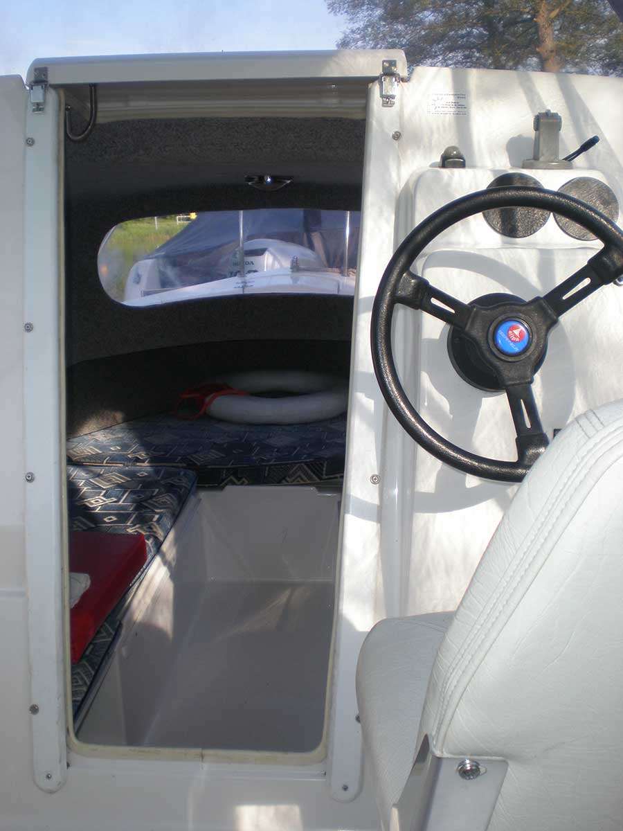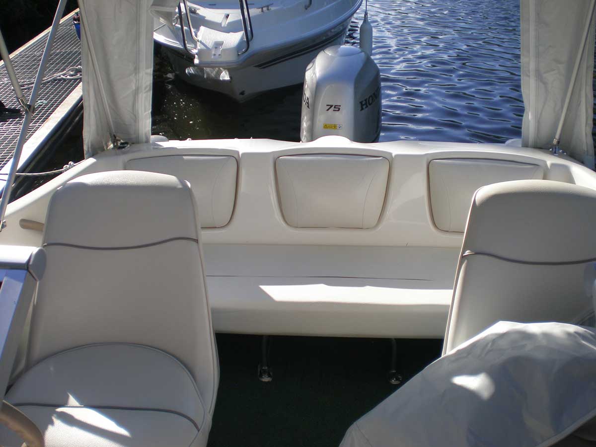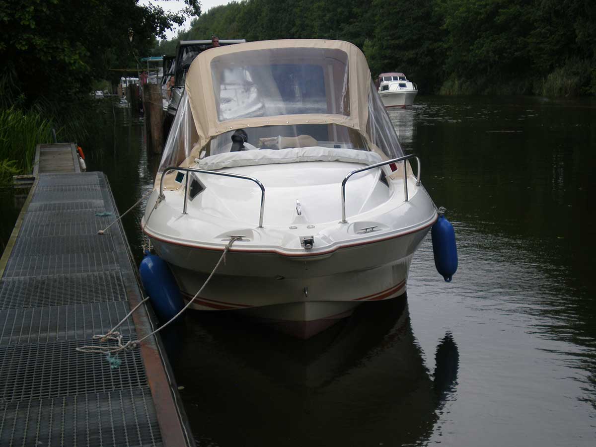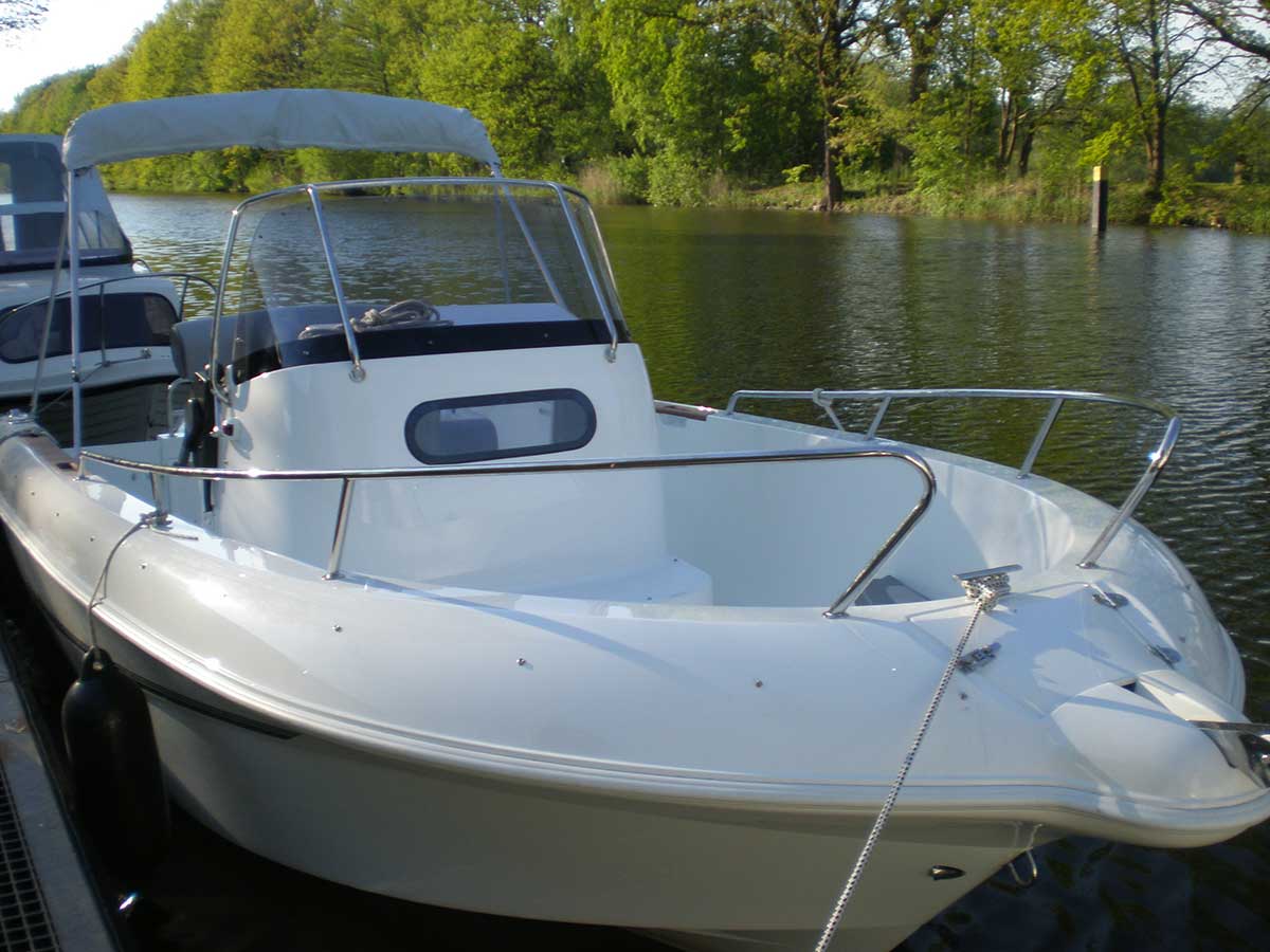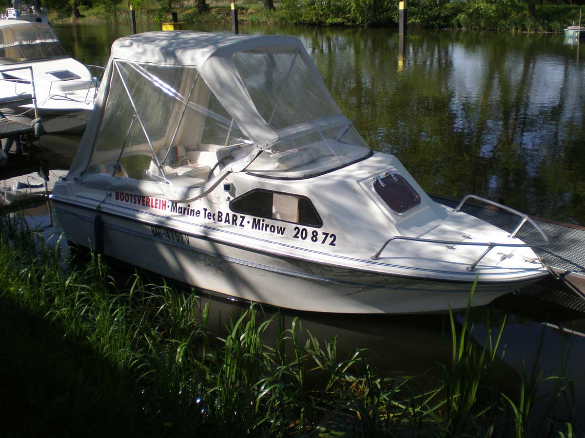 Motorboot mit einer Schlupfkabine (idealer Unterschlupf für Kinder), zwei feststehende Drehstühle und eine Rücksitzbank ; Teppichboden optional; Fahrverdeck hat Sitzhöhe und die Bug- bzw. Heckklappen sind aufrollbar, montierte Badeleiter; ausgerüstet mit einem 100 PS – Bootsmotor (Viertakter; Elektrostart) Länge: 5,49 m; Breite: 2,29 m; höchstzulässige Personenzahl : 6