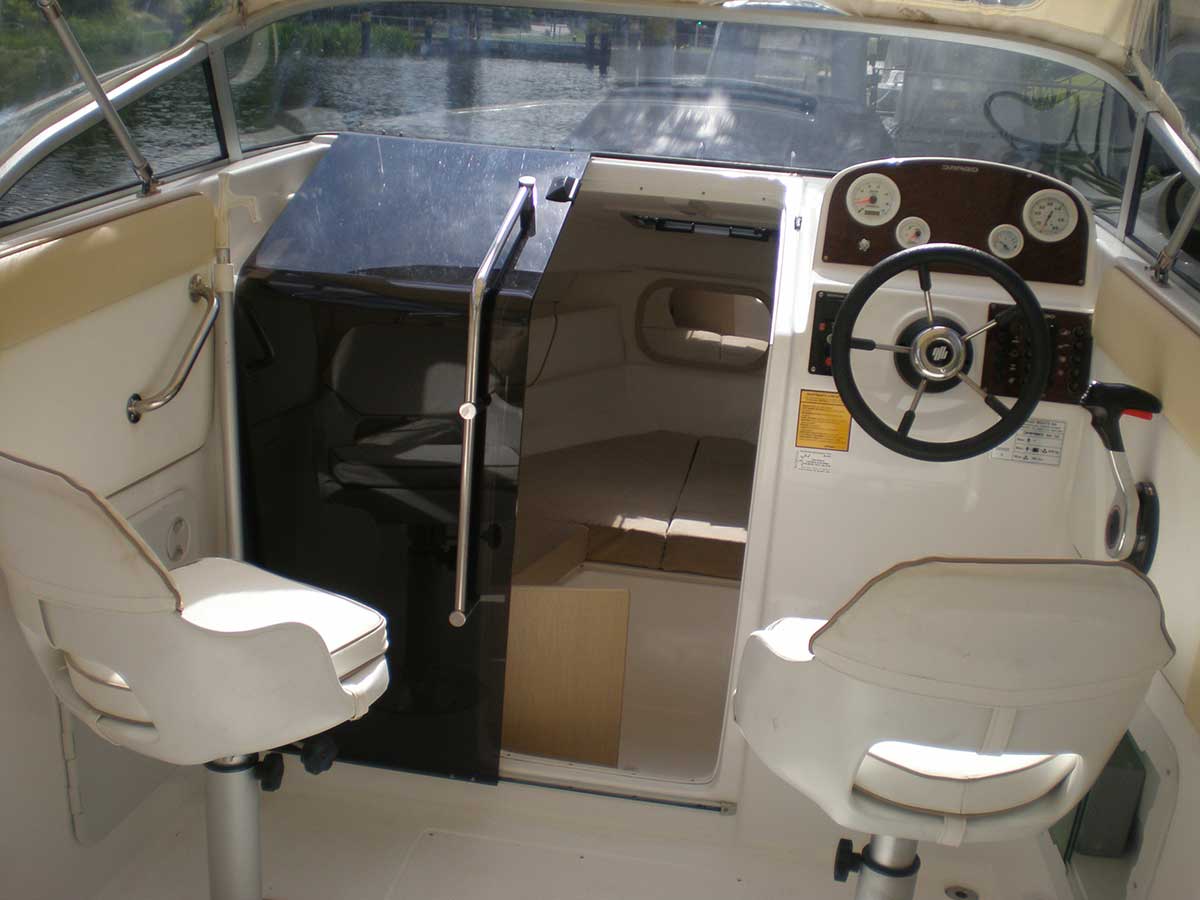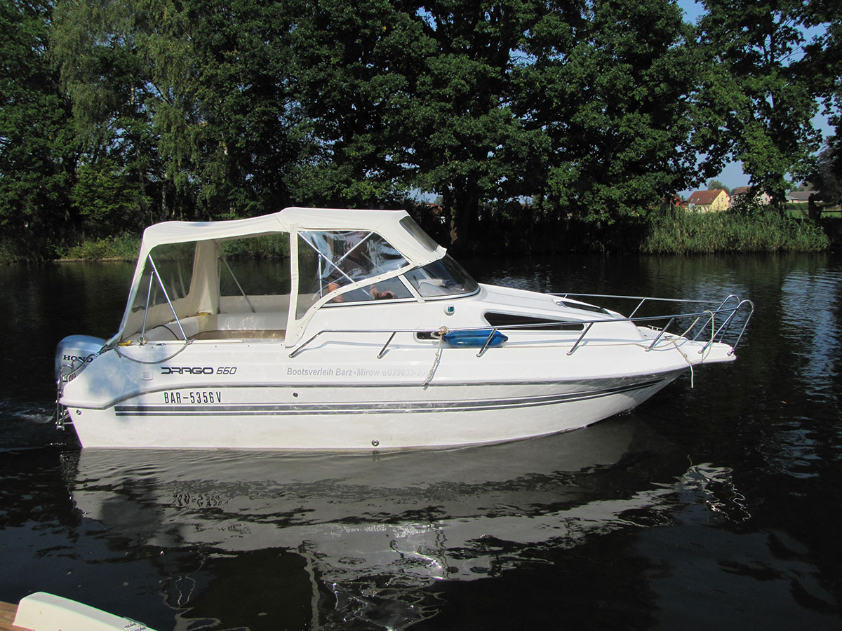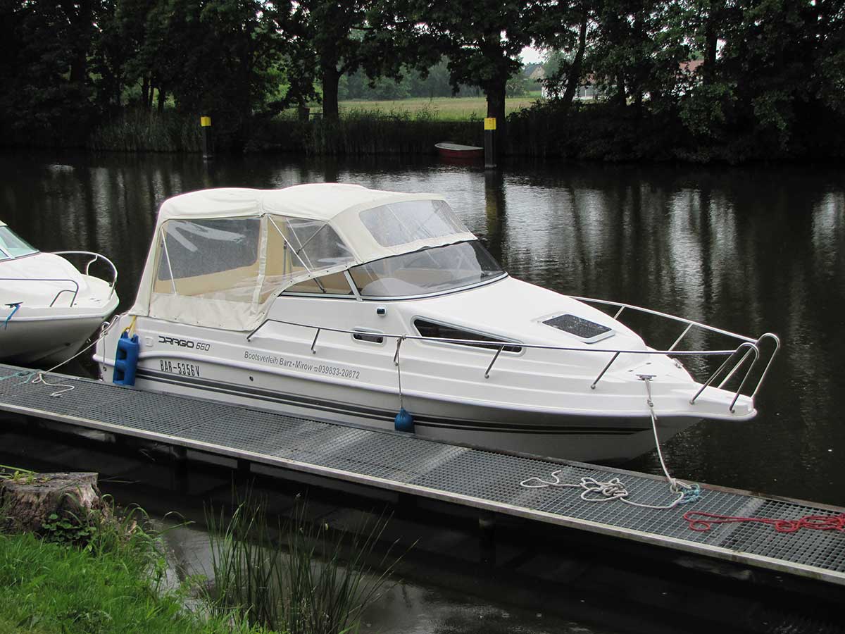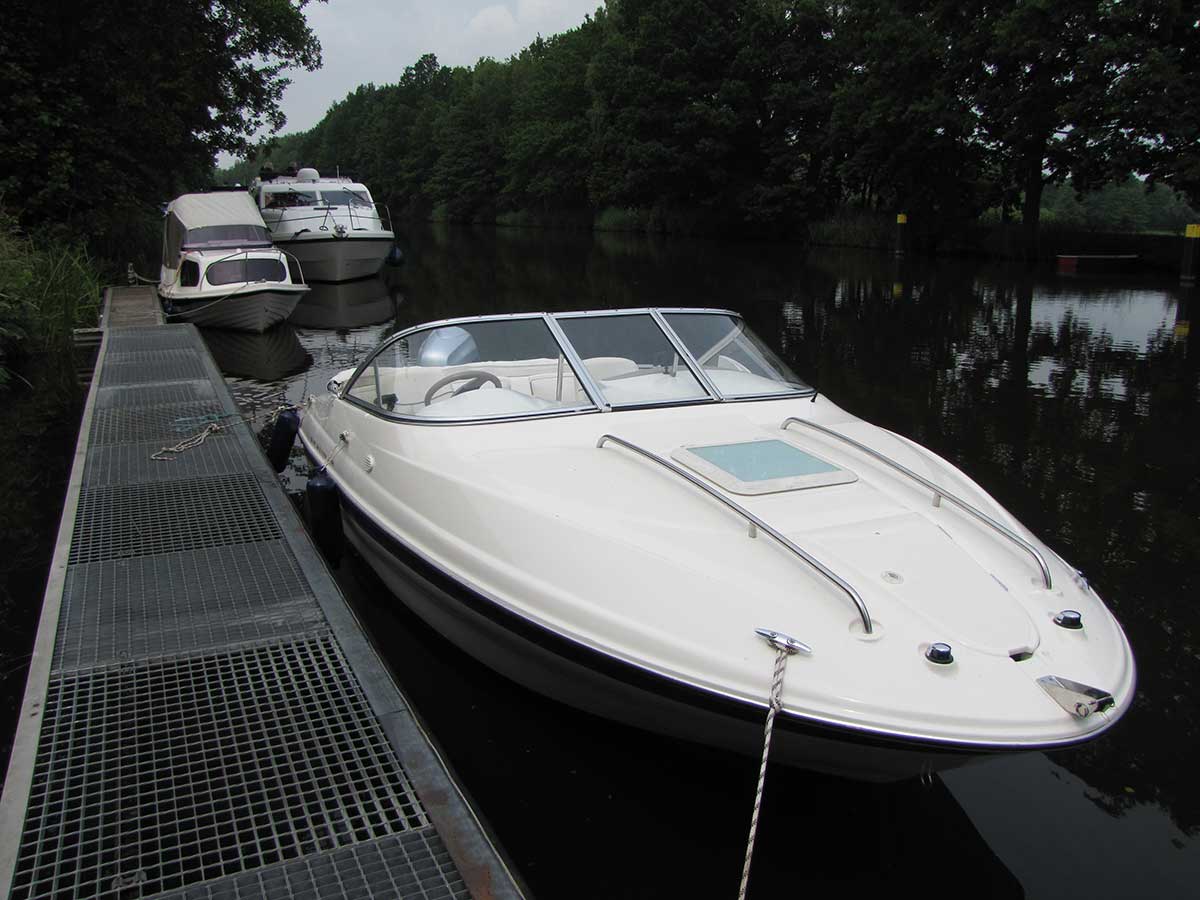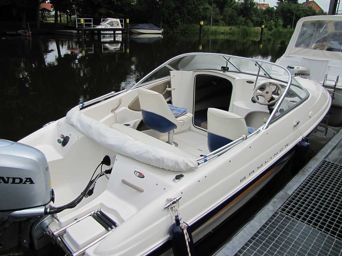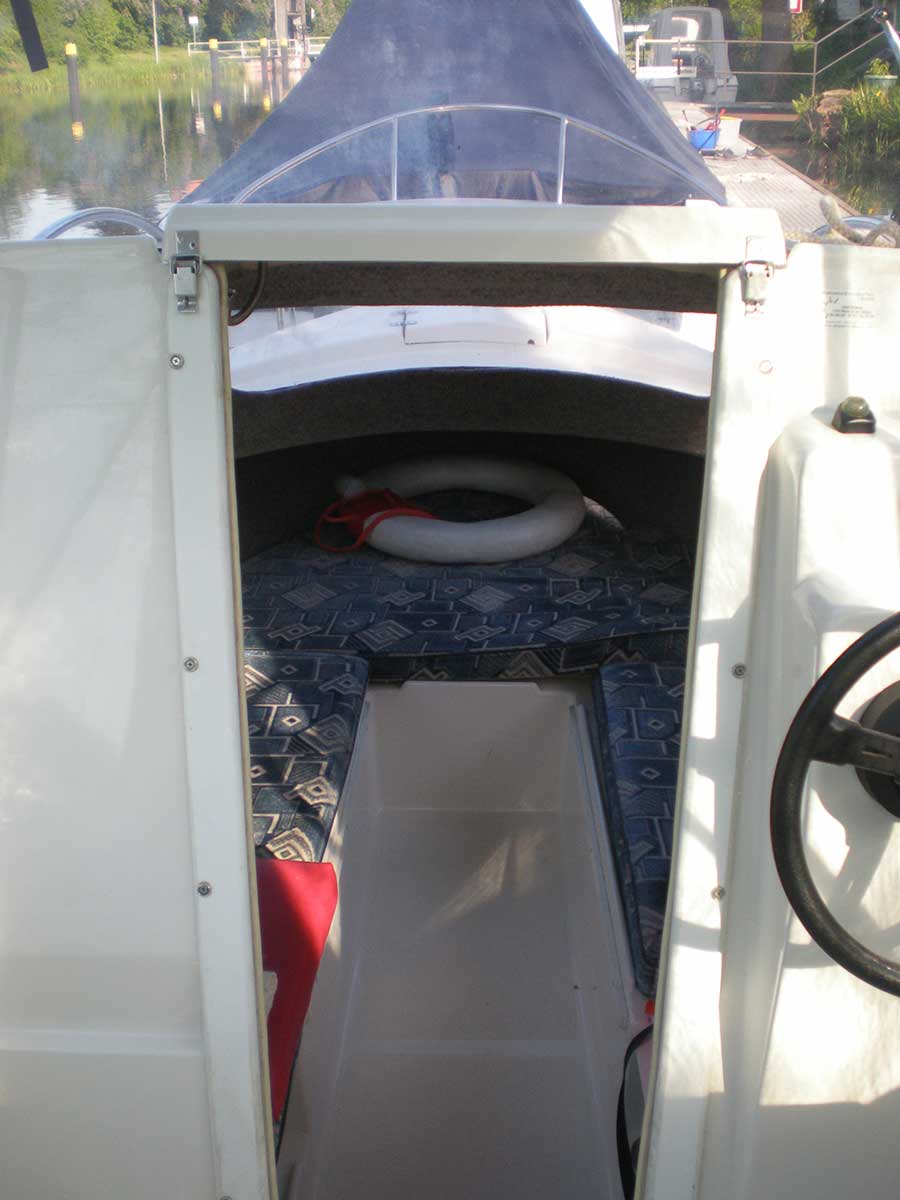 Motorboot mit einer Schlupfkabine (idealer Unterschlupf für Kinder), zwei feststehende Drehstühle und eine Rücksitzbank ; Teppichboden optional; Fahrverdeck hat Sitzhöhe und die Bug- bzw. Heckklappen sind aufrollbar, montierte Badeleiter; ausgerüstet mit einem 100 PS – Bootsmotor (Viertakter; Elektrostart) Länge: 5,49 m; Breite: 2,29 m; höchstzulässige Personenzahl : 6