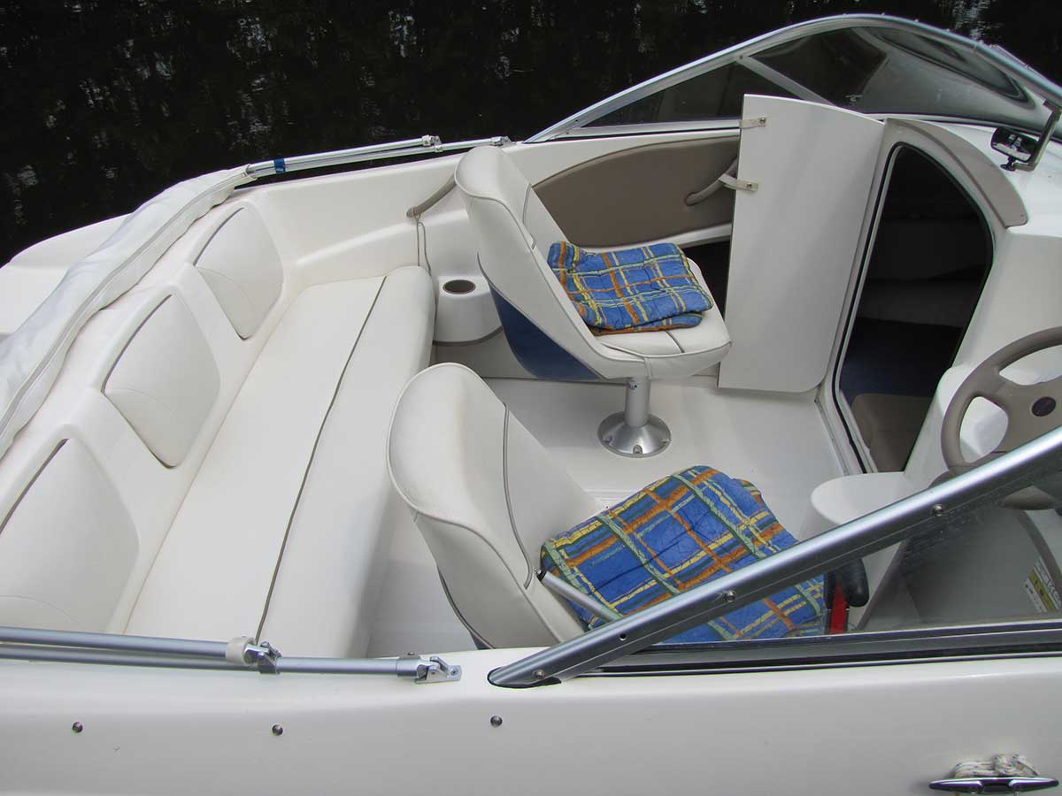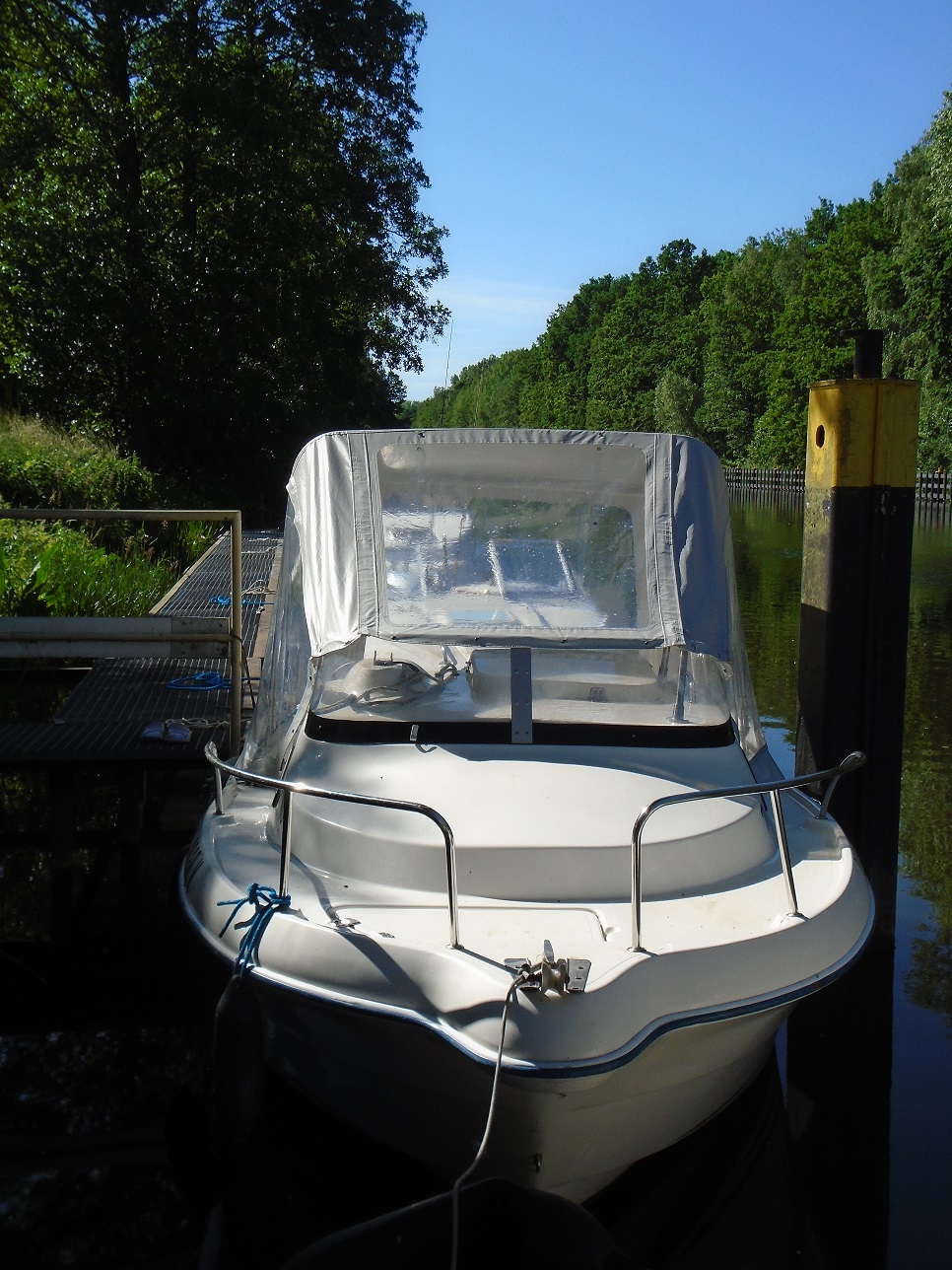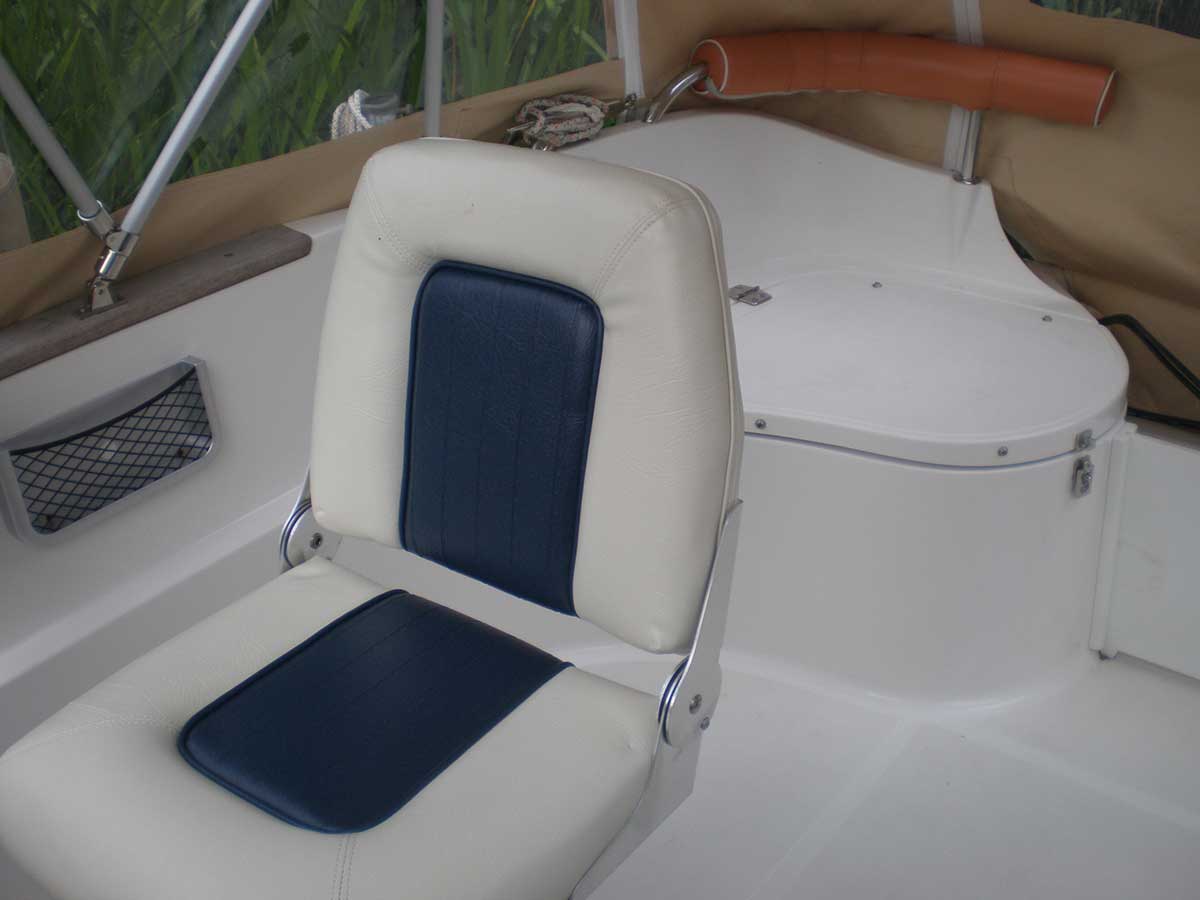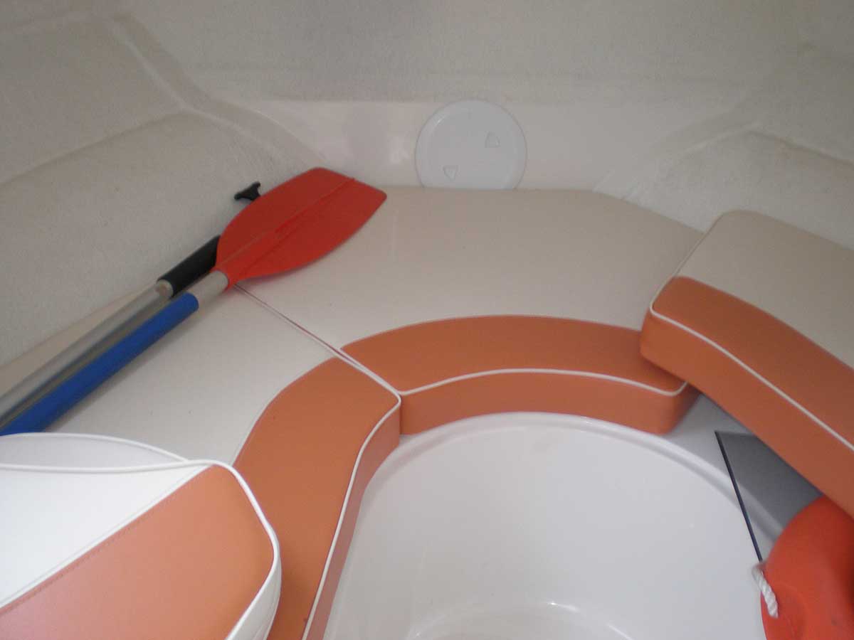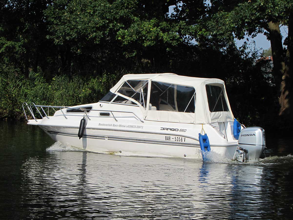 Motorboot mit einer Schlupfkabine (idealer Unterschlupf für Kinder), zwei feststehende Drehstühle und eine Rücksitzbank ; Teppichboden optional; Fahrverdeck hat Sitzhöhe und die Bug- bzw. Heckklappen sind aufrollbar, montierte Badeleiter; ausgerüstet mit einem 100 PS – Bootsmotor (Viertakter; Elektrostart) Länge: 5,49 m; Breite: 2,29 m; höchstzulässige Personenzahl : 6