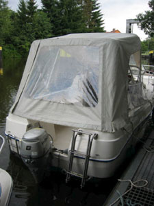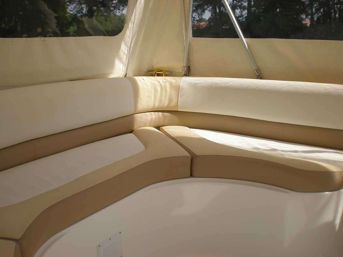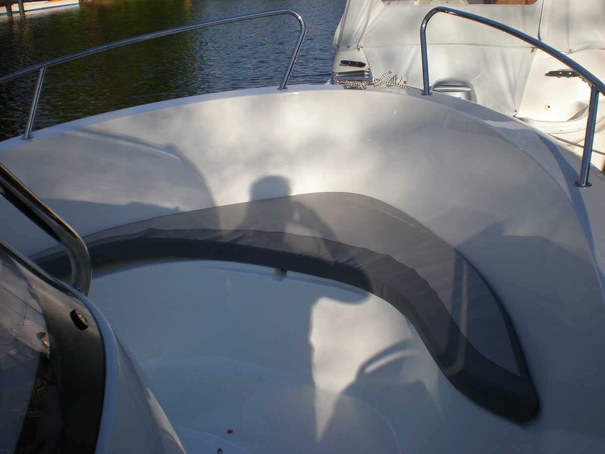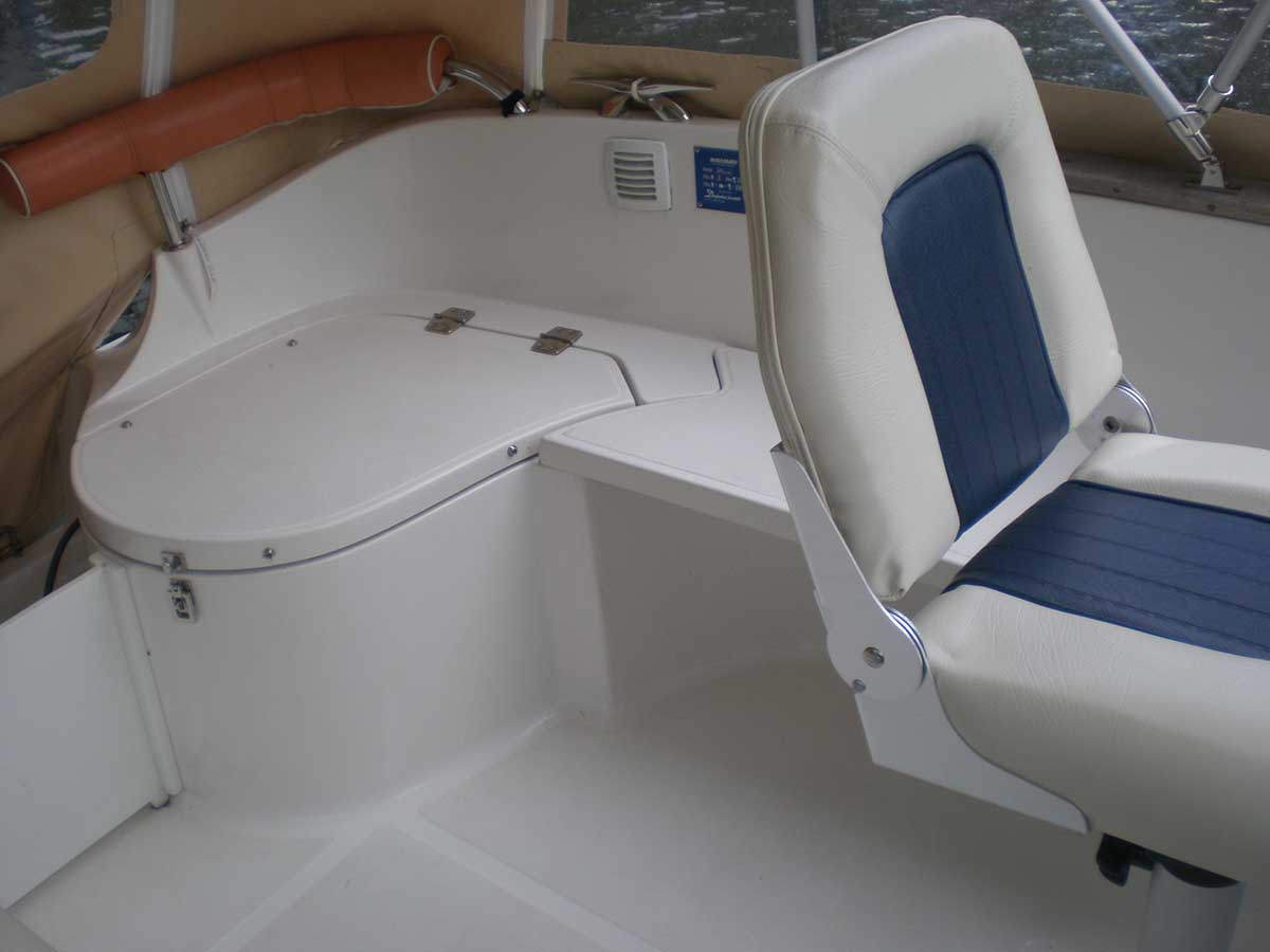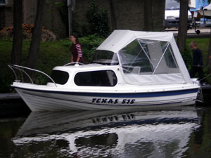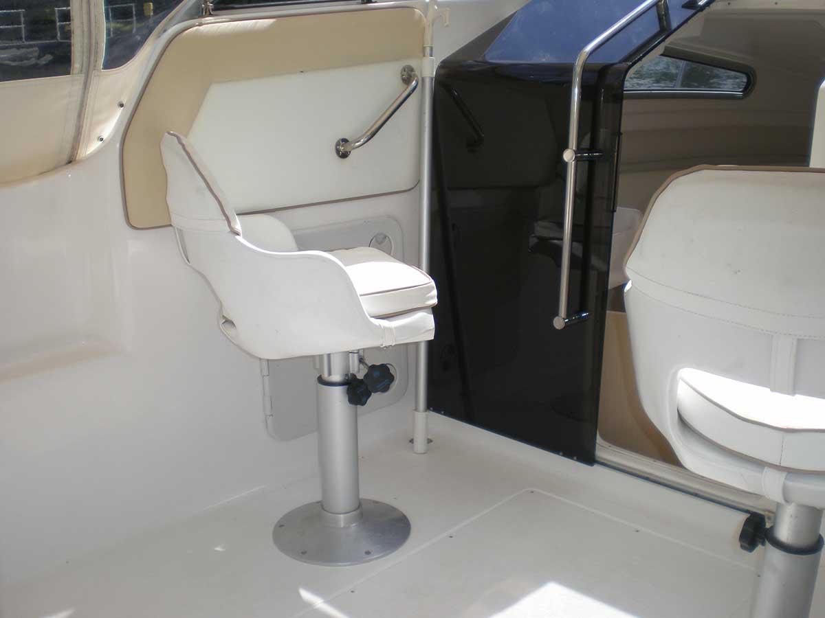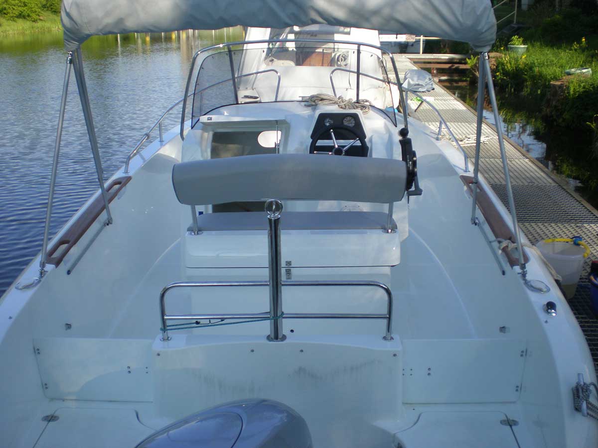 Motorboot mit einer Schlupfkabine (idealer Unterschlupf für Kinder), zwei feststehende Drehstühle und eine Rücksitzbank ; Teppichboden optional; Fahrverdeck hat Sitzhöhe und die Bug- bzw. Heckklappen sind aufrollbar, montierte Badeleiter; ausgerüstet mit einem 100 PS – Bootsmotor (Viertakter; Elektrostart) Länge: 5,49 m; Breite: 2,29 m; höchstzulässige Personenzahl : 6