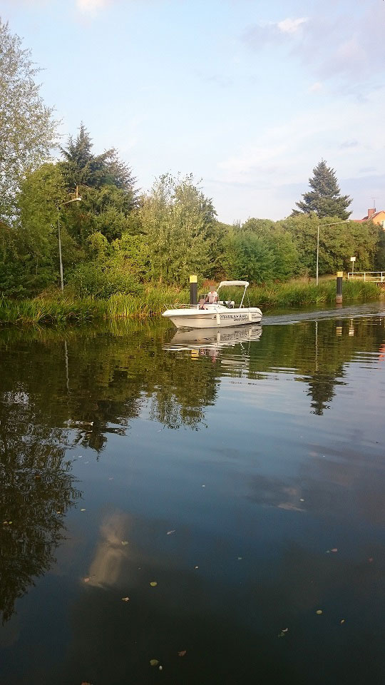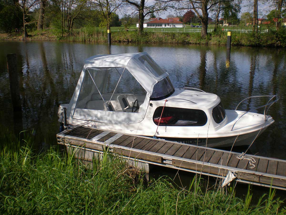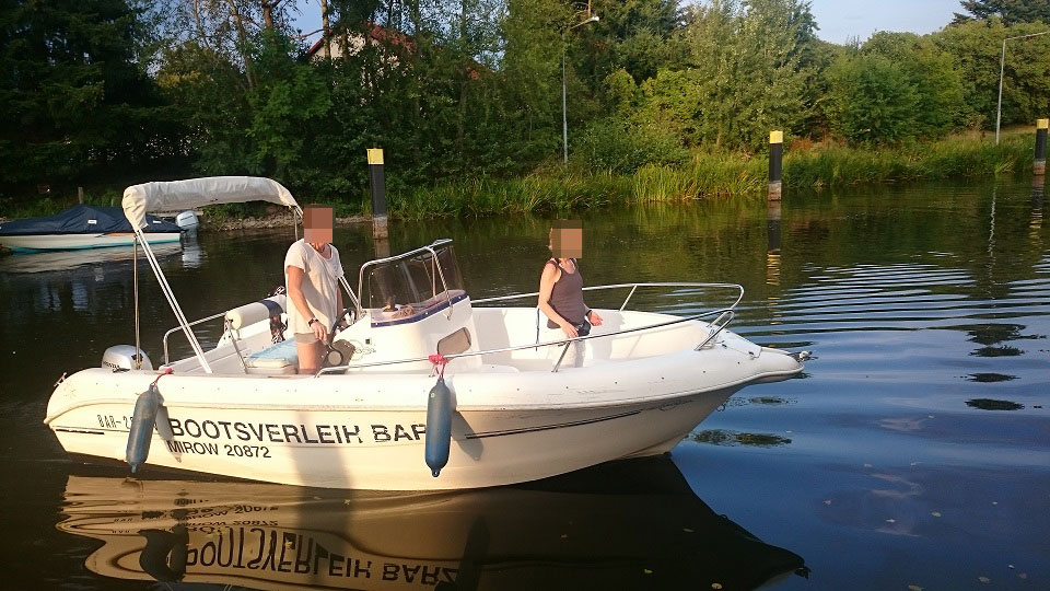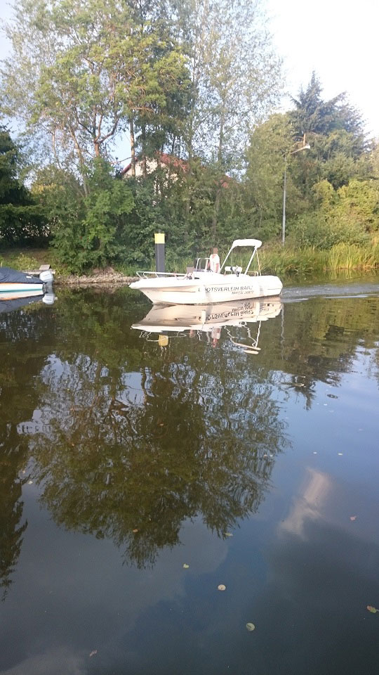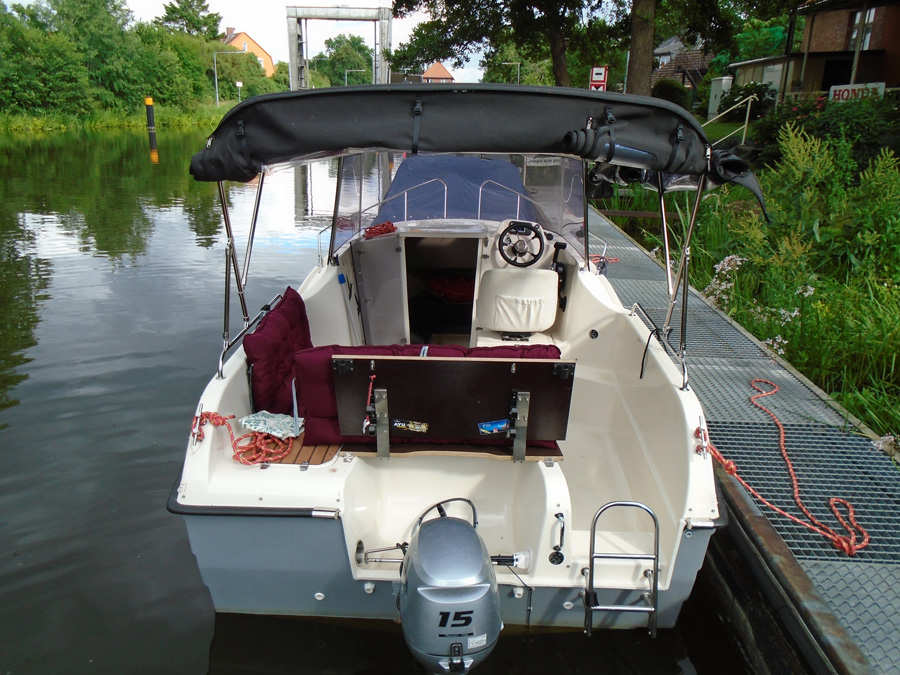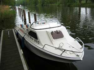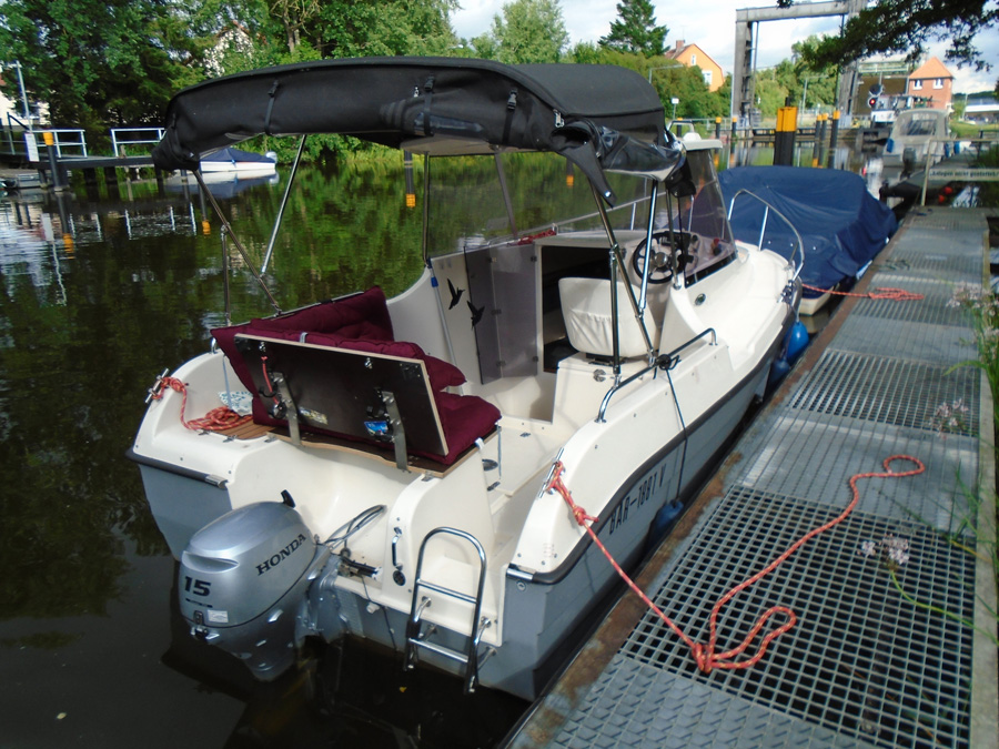Motorboot mit eine großzügigen Kabine (zum schlafen für 2 Personen), einen Steuerstuhl und Sitzbänke, montierte Badeleiter; ausgerüstet mit einem 15 PS – Bootsmotor (Viertakter; Elektrostart) Länge: 5,40 m; Breite: 2,40 m; höchstzulässige Personenzahl : 6. Das Boot ist zum Angeln gut geeignet.