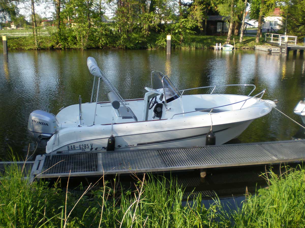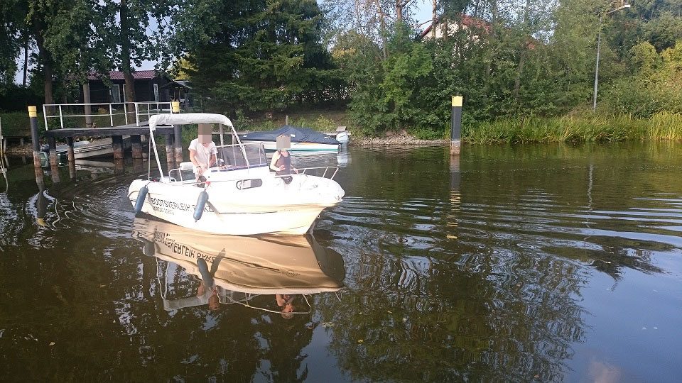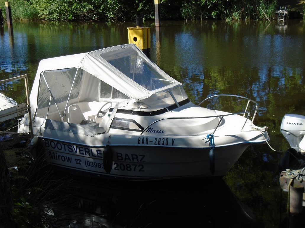 Konsolenmotorboot geeignet für bis zu 6 Personen, sehr geräumig; wird gern zum angeln genommen; Mittelsteuerstand mit großräumiger Kabine zum unterbringen von Taschen und Badesachen etc.; im hinteren Teil des Bootes befinden sich zwei Sitzbänke, im vorderen Teil ebenfalls großzügige Sitzmöglichkeiten; montierte Badeleiter; ausgerüstet mit einem 15 PS – Bootsmotor (Elektrostart) Länge: 5,68 m; Breite: 2,54 m; höchstzulässige Personenzahl : 6