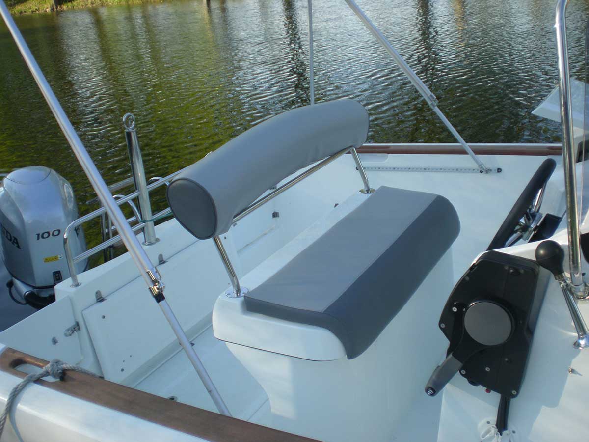 Motorboot mit eine großzügigen Kabine (zum schlafen für 2 Personen gut geeignet), einen Steuerstuhl und Sitzbänke, montierte Badeleiter; ausgerüstet mit einem 15 PS – Bootsmotor (Viertakter; Elektrostart) Länge: 5,15 m; Breite: 1,81 m; höchstzulässige Personenzahl : 5