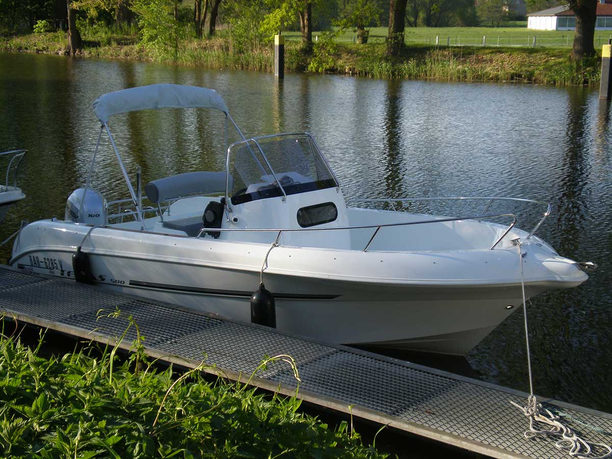 Konsolenmotorboot ideal zum Wasserski fahren, sehr geräumig; Mittelsteuerstand mit großräumiger Kabine zum unterbringen von Taschen, Wasserski und Badesachen etc.; im hinteren Teil des Bootes befinden sich zwei Sitzbänke, im vorderen Teil ebenfalls großzügige Sitzmöglichkeiten; montierte Badeleiter; ausgerüstet mit einem 100 PS – Bootsmotor (Elektrostart) Länge: 5,68 m; Breite: 2,54 m; höchstzulässige Personenzahl : 6