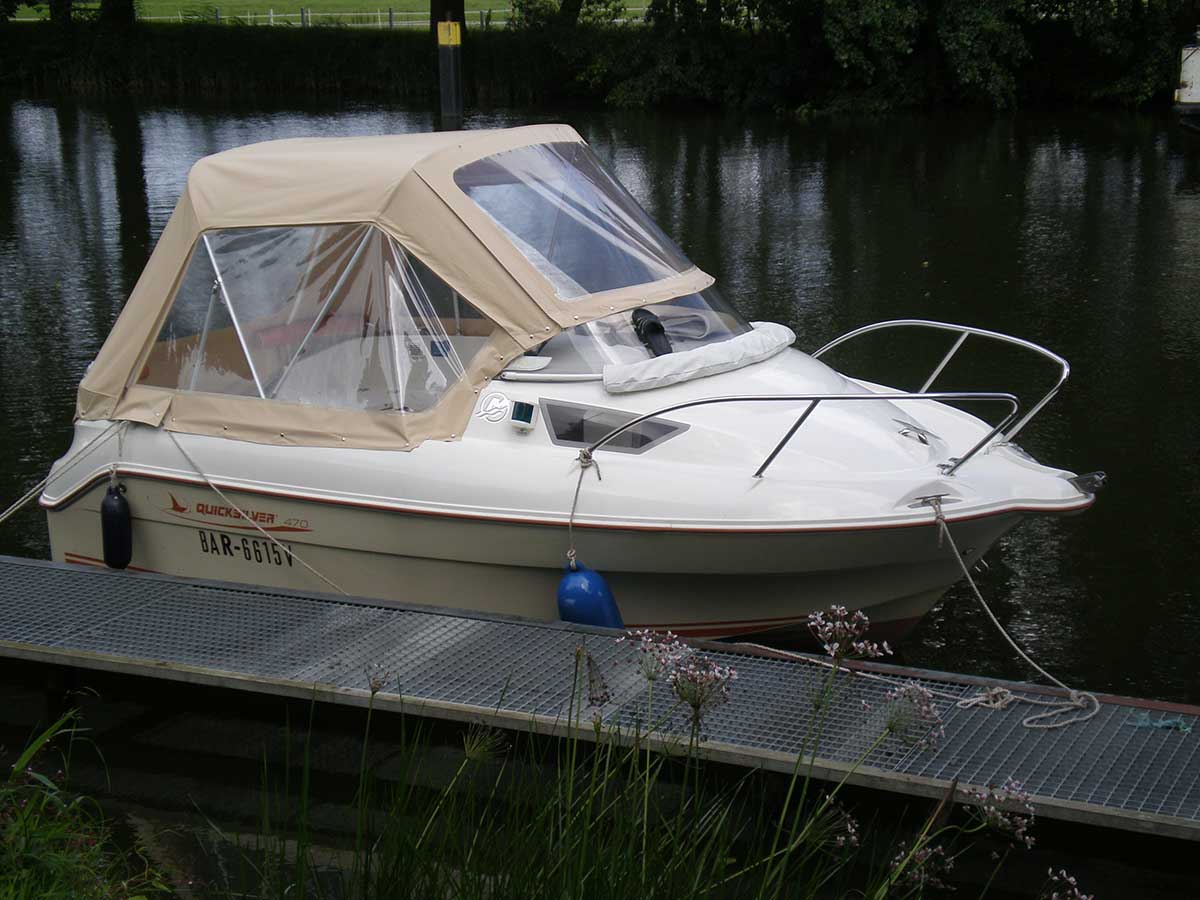 Motorboot mit einer kleinen Kabine (zum schlafen nicht geeignet), vier feststehende Sitze, Badeleiter zum überhängen; ausgerüstet mit einem 8 PS – Bootsmotor (Viertakter; Elektrostart) Länge: 4,70 m; Breite: 1,80 m; höchstzulässige Personenzahl : 4