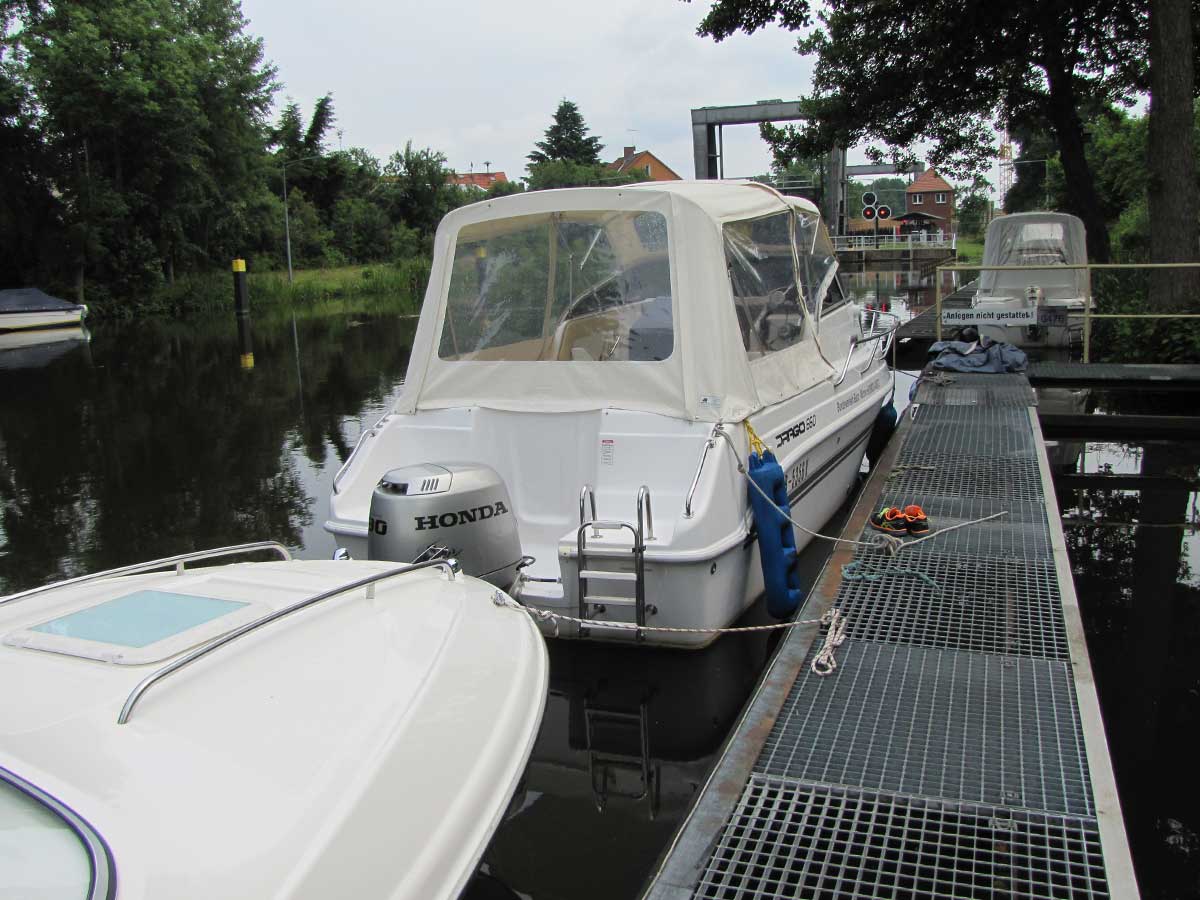 Motorboot mit einer Kabine (zum schlafen für 2 Personen gut geeignet), zwei feststehende Drehstühle und eine Rückensitzbank, montierte Badeleiter; ausgerüstet mit einem 90 PS – Bootsmotor (Viertakter; Elektrostart) Länge: 6,00 m; Breite: 2,26 m; höchstzulässige Personenzahl : 6